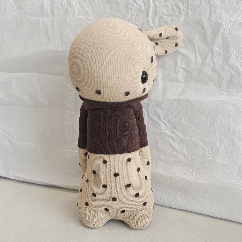 Nutty Bunny is a bundle of bouncy fun and playful mischief! With his tan fur, covered in black polka dots, and his adorable chocolate brown jumper, he’s always dressed for fun. His floppy, cute ears bounce with every giggle, and his silly grin is sure to spark joy wherever he goes.